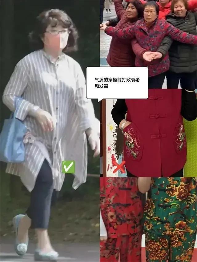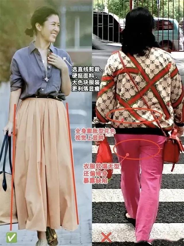 虽然建议大家选择一些印花的衣服单品来穿搭,但是选择的衣服款式过于花哨,或者是说色彩老气,穿起来也会显得土气廉价,例如下面右边的这一套穿衣打扮,用的就是非常复杂,设计的外套搭配上粉色的长裤,啊,而且这一件的面料软塌无形,穿在身上根本达不到修身的效果,轻松的就把身材的缺点全部暴露出来。