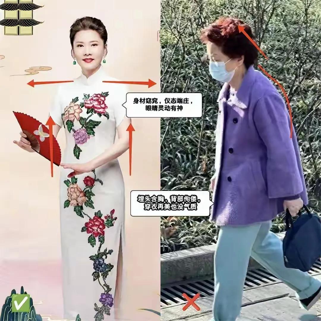 当然也不是说印花的衣服就不好看,纯色的衣服就好看,这种观点也是不正确的,咱们看下面的对比图就可以得出一个非常明确的答案,右边的这一件紫色的外套搭配上浅蓝色的长裤,这样的一幅色彩穿在身上,其实也没有气质,主要的原因是人的身材含胸驼背,而且衣服款式过于宽大,所以没办法穿出那种气场来。