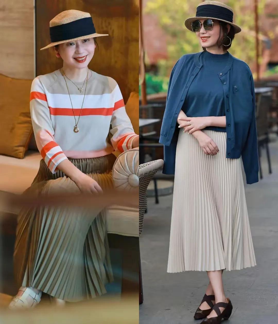 在这个春季,我个人还蛮推荐大家选择针织衣服单品搭配上百褶半身裙的,特别是中年女性采用这样的穿衣打扮,会让你变得更加优雅得体一点也不油腻,比如一件拼接色的条纹针织上衣,搭配上百褶半身裙,头上戴了一款草帽,脖子上在挂着一款金色的项链,这一身穿衣造型就很优雅。或者换成蓝色的针织开衫,搭配同色系的打底衫和一条白色的百褶半身裙,脚踩一双棕色的浅口单鞋,这一身穿衣打扮温柔得体。