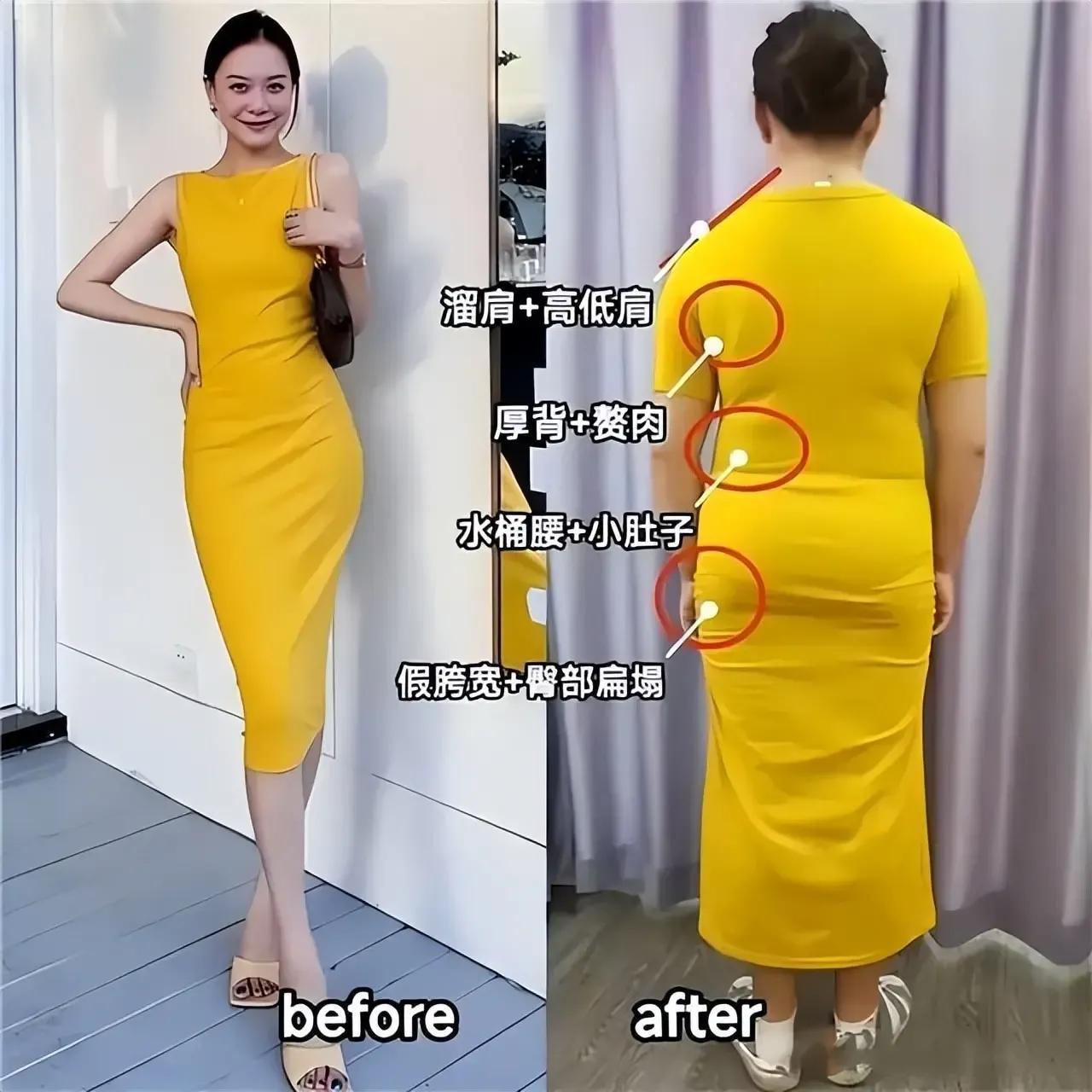 身材不同,穿同一件衣服出来的效果天壤之别,咱们看下面这两张图的对比,都是黄色的连衣裙,拥有高挑纤瘦的身材,穿出来之后特别的抢眼抢镜,很迷人;但是如果身材发福发胖,腰间有赘肉,胯宽腿粗,臀型扁塌,传了之后就像右边的这张图一样,会形成溜肩高低肩,甚至会把赘肉,水桶腰小肚腩,假胯宽,臀型扁塌,全部暴露无遗。